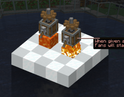 보너스기능으로 뜨거운 블럭 위에 해당 블럭을 향하도록 팬을 설치하고 레드스톤 신호를 줄 경우 동력을 생산해요.